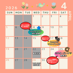 4月のイベントはこちら!※イベント日の通常利用も可能です!※イベント参加者数は随時更新いたします✨ 【イベント一覧】4/8(水) カルカソンヌ段位道場🔥4/17(金) Comorebiテストプレイ会🎲4/25(土) ミス […]